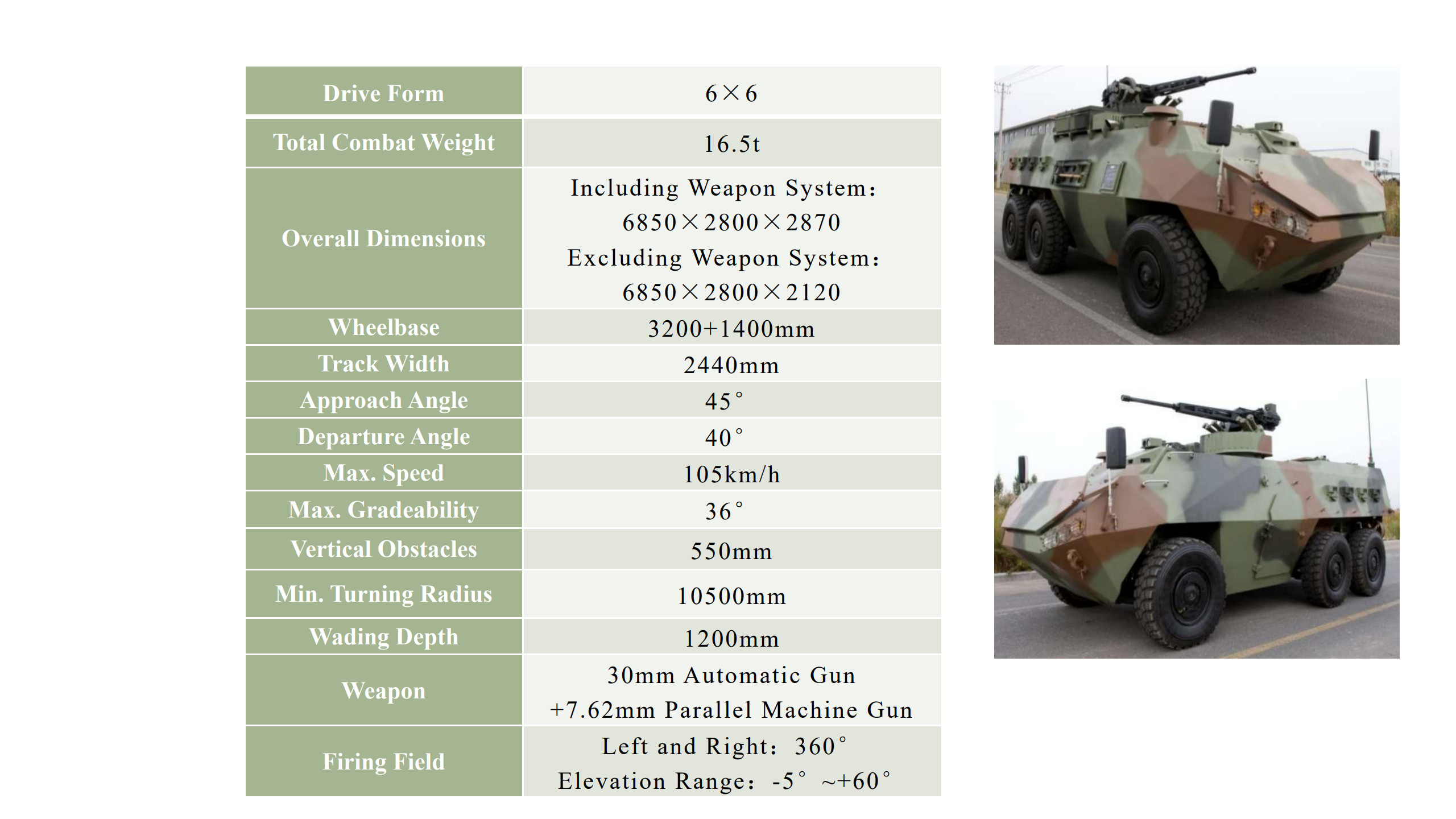 | Dimensions | 6850×2800×2870mm (with weapon system) |